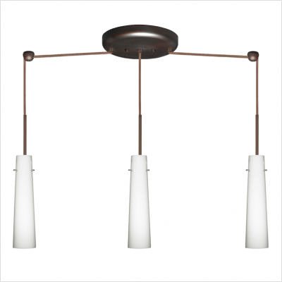 3QB-5674CM-BR Bulb type: Halogen, Finish: Bronze, Glass Shade: Cobalt Blue Matte Pictured in Bronze with Opal Matte Shade Features: -Three light mini pendant. -Camino collection. -Available in Bronze or Satin Nickel finishes. -Available in several glass shades. -Brass and steel construction. -Canopy style: Linear. -Installs directly to a 4'' round or octagonal ceiling box. -Handcrafted glass. -Suitable for sloped ceilings. -UL listed. -Suitable for damp locations (interior use only). Specifications: -B series accommodates (3) 50W E12 xenon or 40W B10 incandescent bulb (not included). -Q series accommodates (3) 40W G9 halogen bulb (included). -Manufacturer provides one year warranty. -Shade Height: 10''. -Cord length: 120''. -Overall dimensions: 120'' H x 2.5'' W x 2.5'' D. For more information on this product please view the Sheet(s) below: Camino Three Light Mini Pendant Specification Sheet